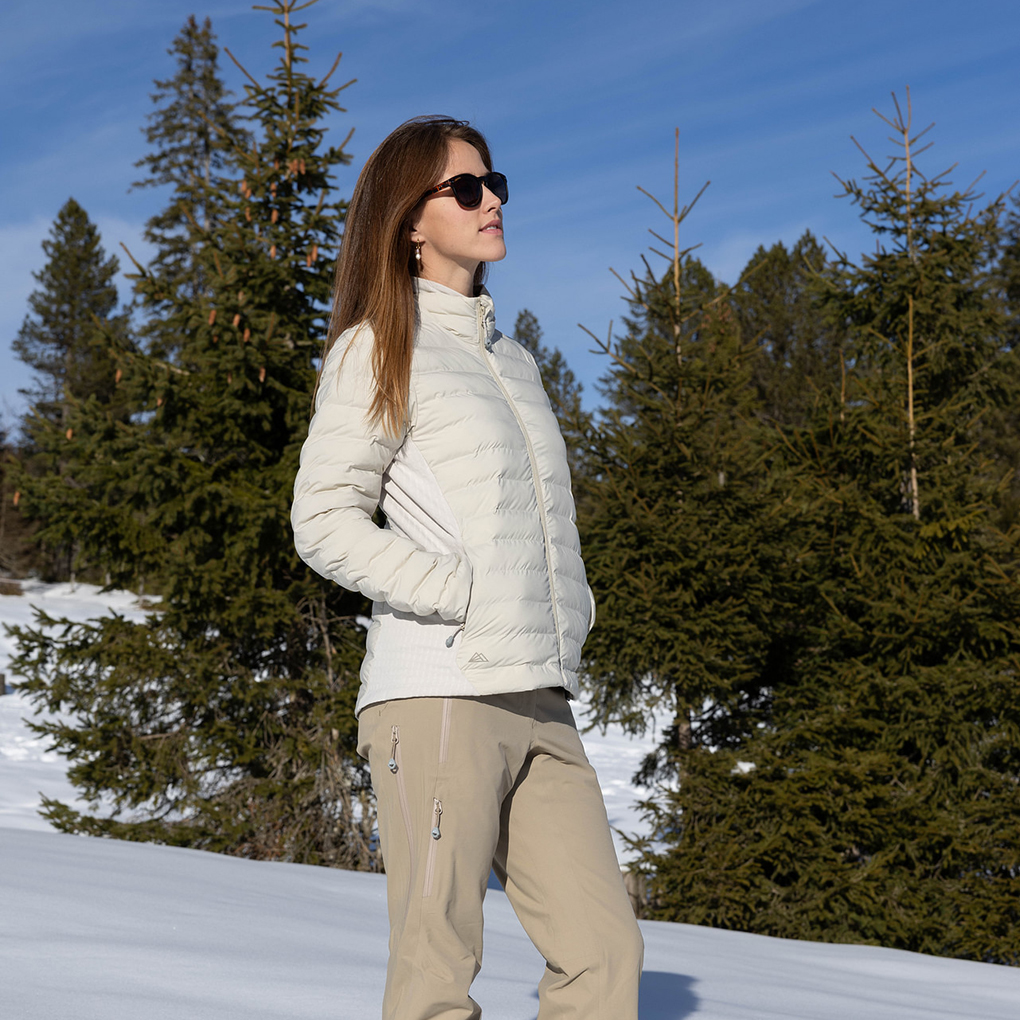 Mit zwei praktischen RV-Fronttaschen hast du wichtige Essentials immer griffbereit, während das robuste und elastische Shell-Material für Langlebigkeit sorgt. Egal ob auf Hochtour, beim Wandern oder auf Reisen  die R3 Hybrid Insulated Jacket W überzeugt durch ihre Vielseitigkeit, ihr geringes Gewicht und ihr kleines Packmass.