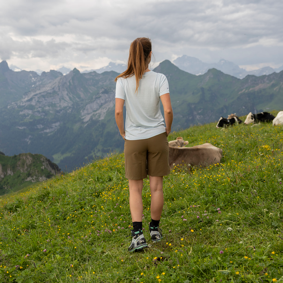 Das R5 Mint Scenic T für Damen verbindet natürlichen Tragekomfort mit funktioneller Frische. Die innovative R’Mint Materialmischung nutzt Minz-Extrakte in der Viskosefaser, um Geruchsbildung auf natürliche Weise zu hemmen. Das leichte Gewebe sorgt für ein angenehmes Hautgefühl und eignet sich ideal für aktive Tage draussen oder entspannte Stunden im Alltag. In Europa gefertigt – frisch, funktional und vielseitig.